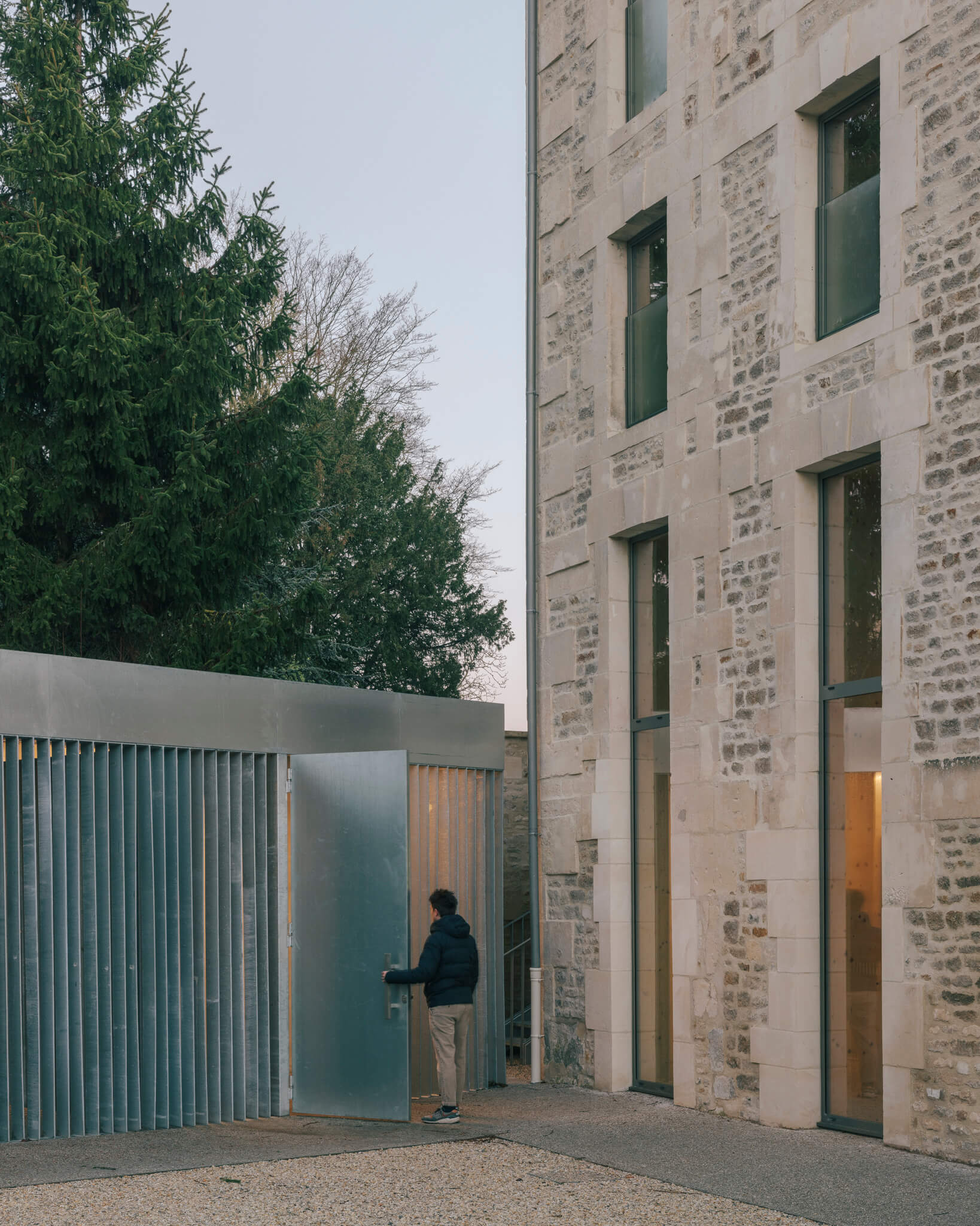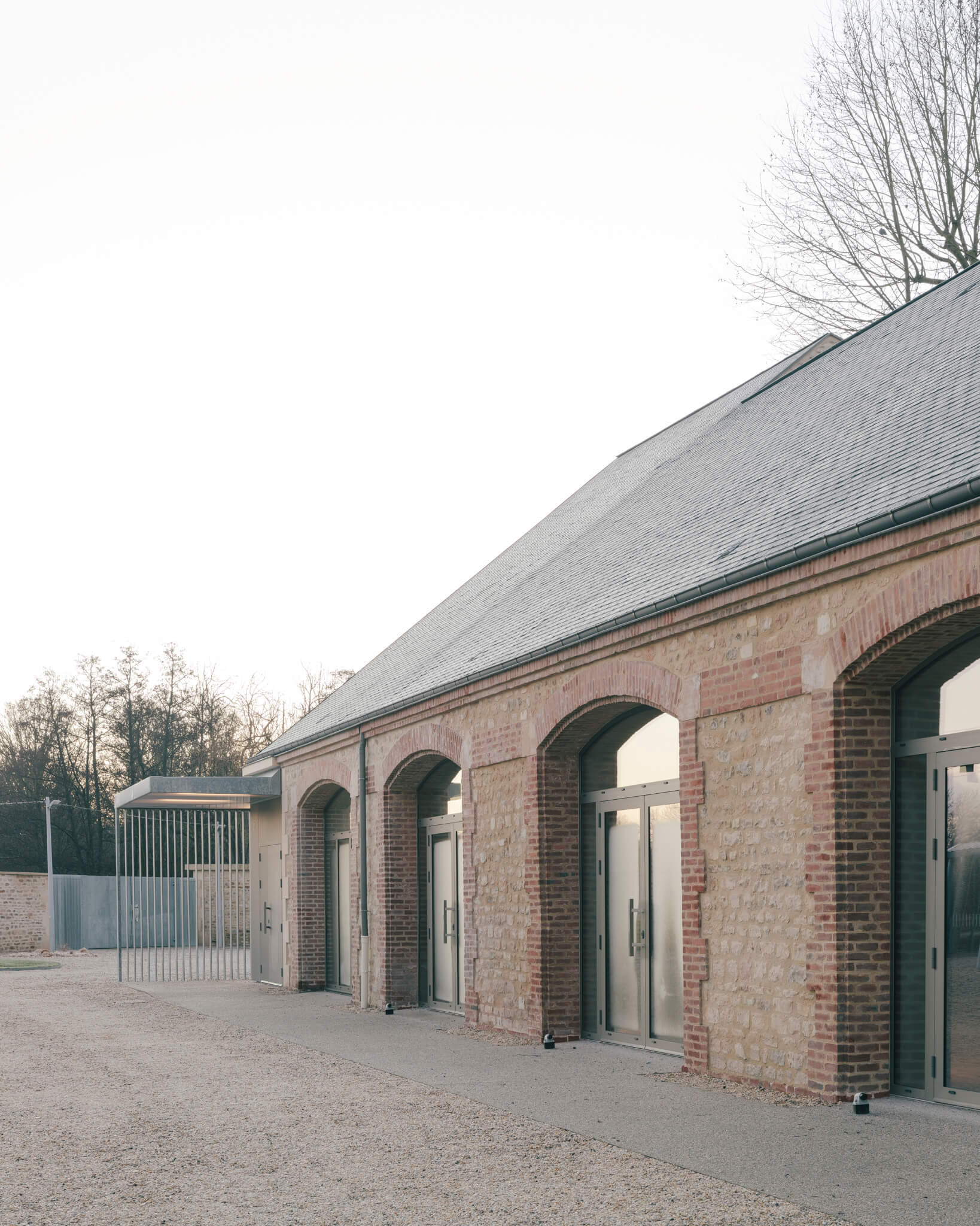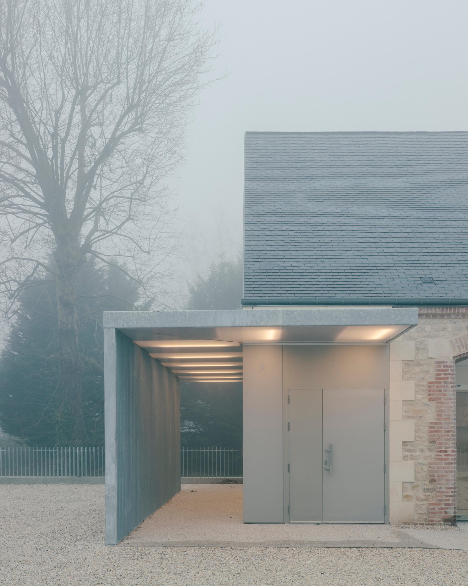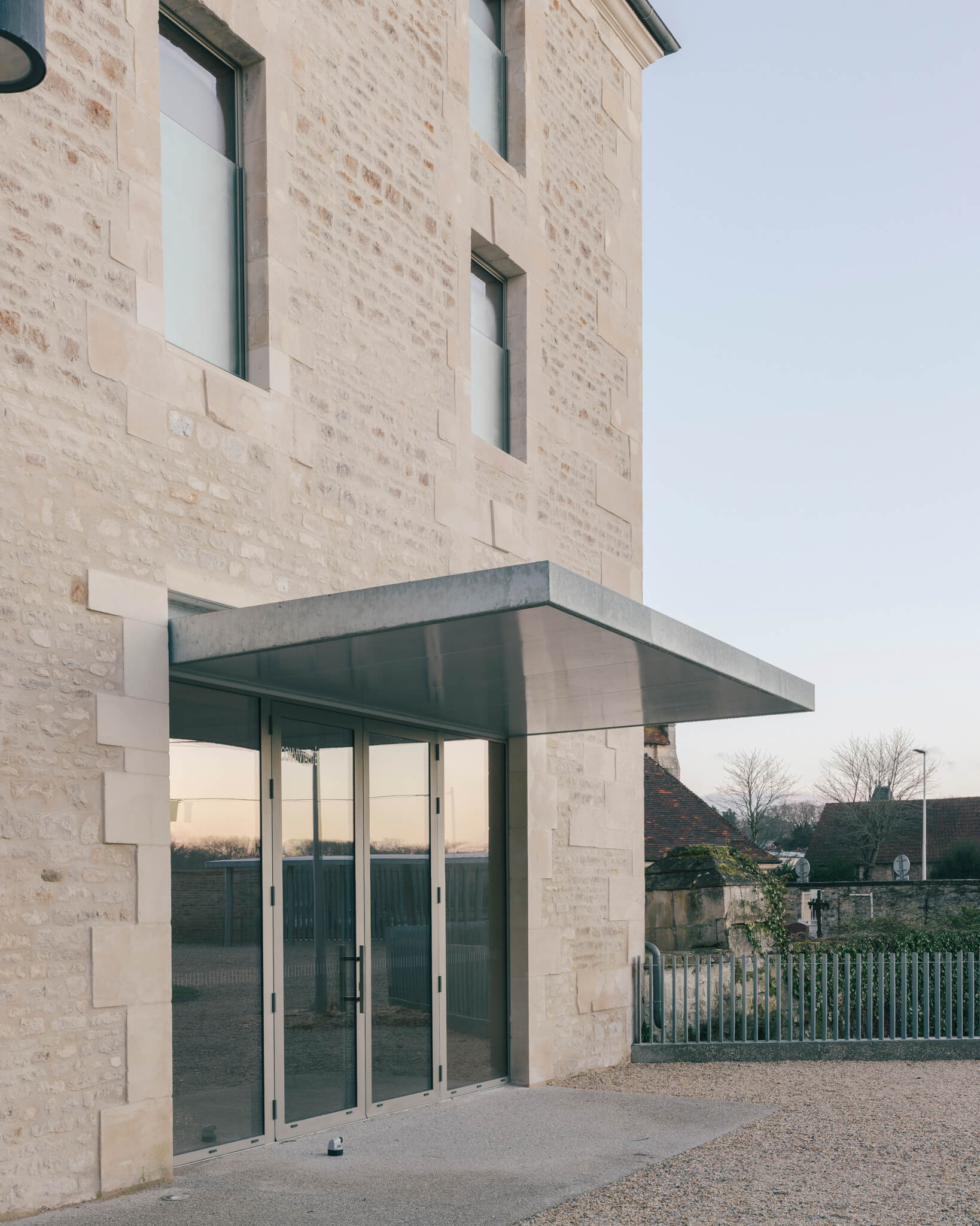 Ici la nouvelle générosité des entrées, la mise en place de auvents protecteurs, la réalisation d’un préau liant les deux bâtisses, la proposition de menuiseries anodisées à la teinte irisée ou encore les aménagements paysagers sont autant « d’amabilités » ayant pour ambition de proposer aux visiteurs un projet à la fois fonctionnel et poétique.