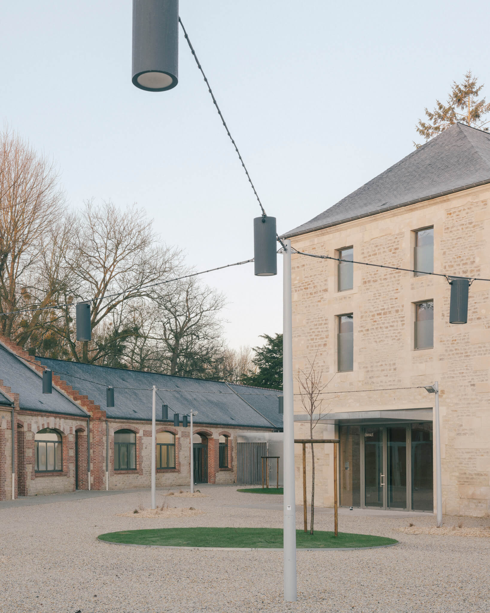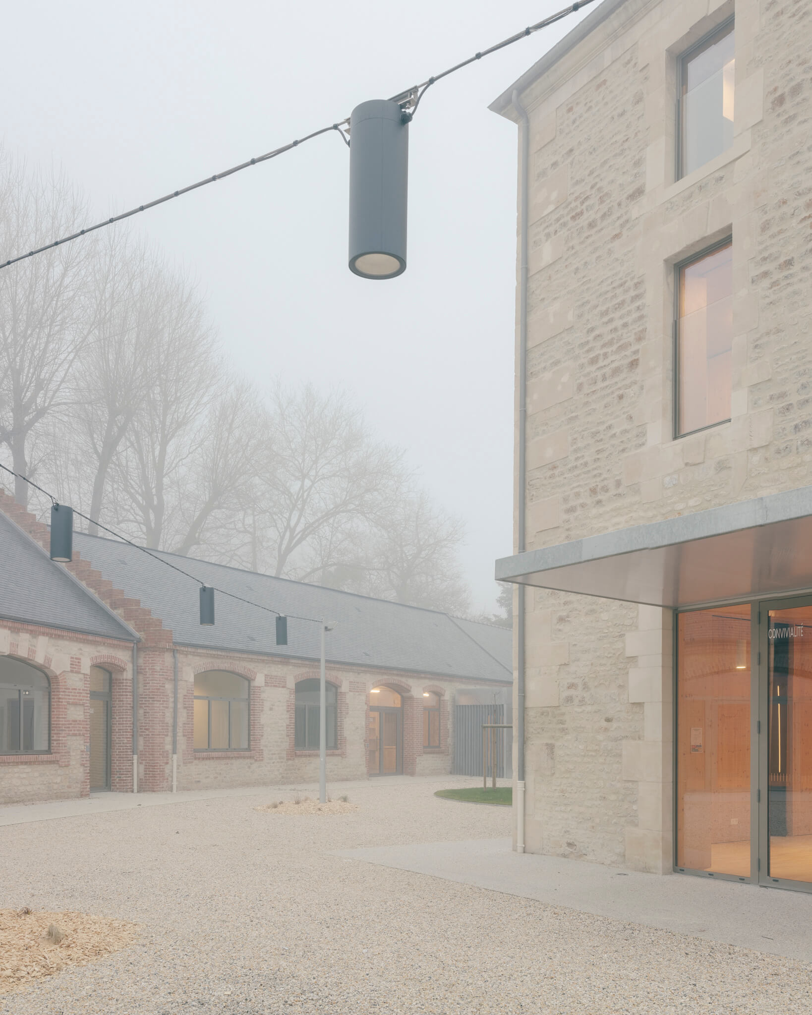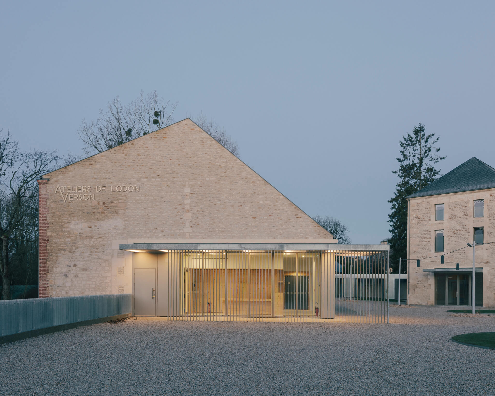 Ici la nouvelle générosité des entrées, la mise en place de auvents protecteurs, la réalisation d’un préau liant les deux bâtisses, la proposition de menuiseries anodisées à la teinte irisée ou encore les aménagements paysagers sont autant « d’amabilités » ayant pour ambition de proposer aux visiteurs un projet à la fois fonctionnel et poétique.