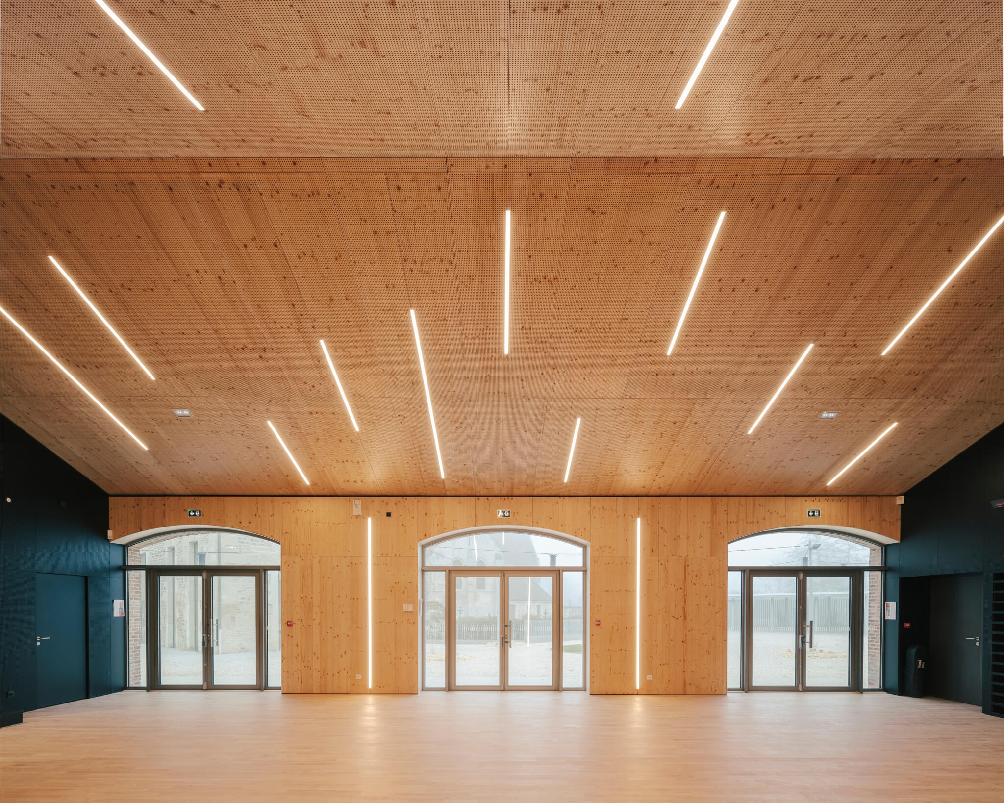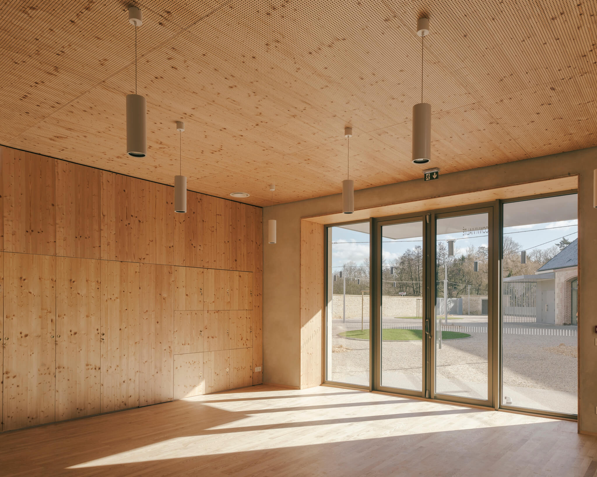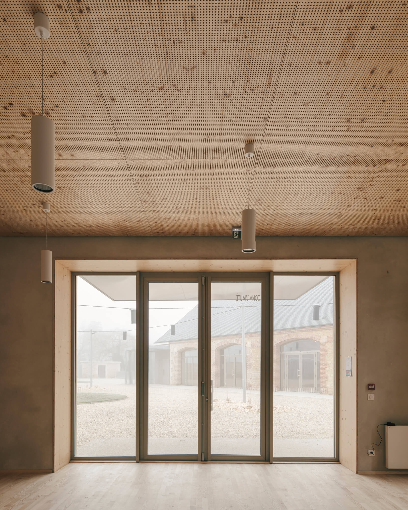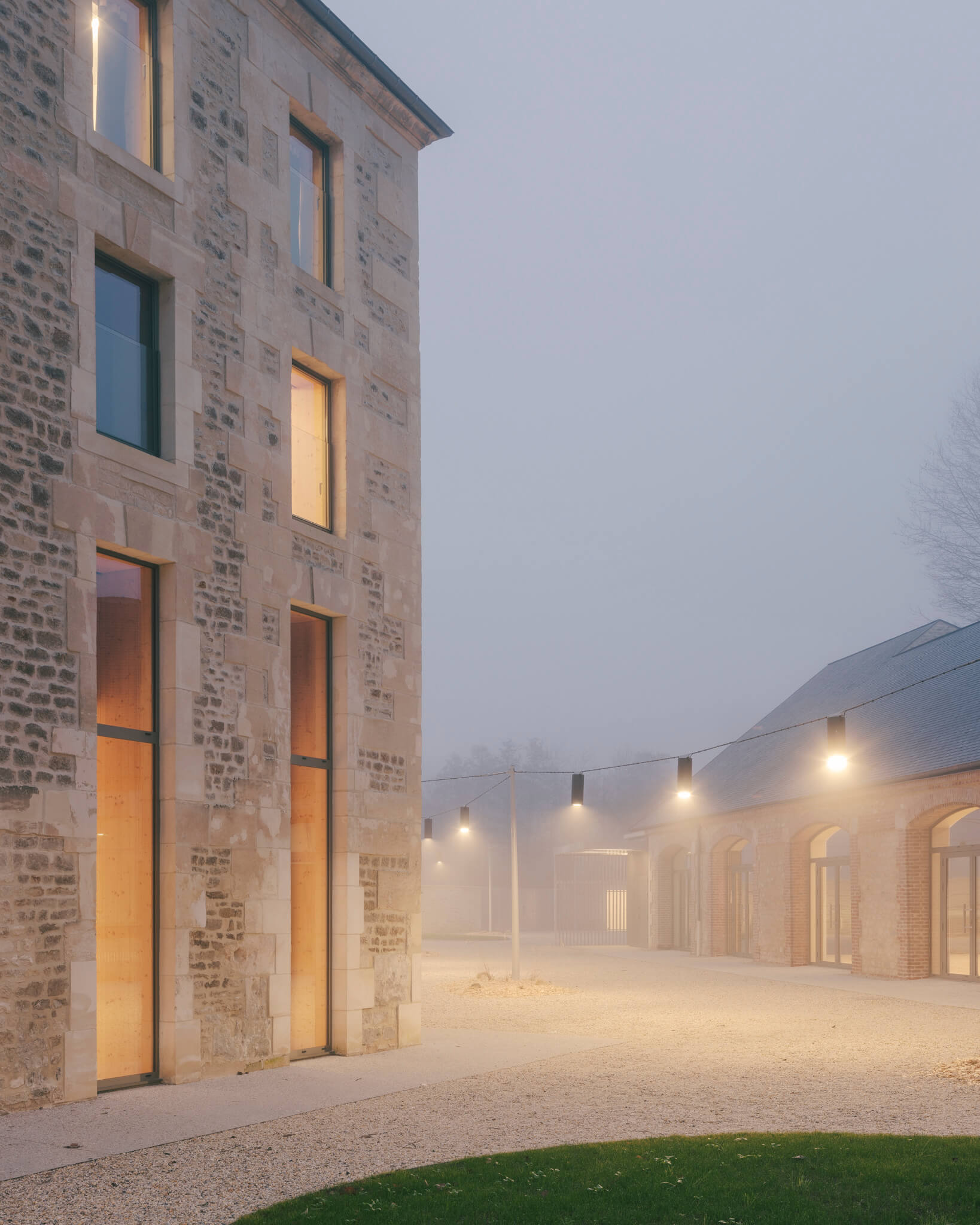 Ici la nouvelle générosité des entrées, la mise en place de auvents protecteurs, la réalisation d’un préau liant les deux bâtisses, la proposition de menuiseries anodisées à la teinte irisée ou encore les aménagements paysagers sont autant « d’amabilités » ayant pour ambition de proposer aux visiteurs un projet à la fois fonctionnel et poétique.