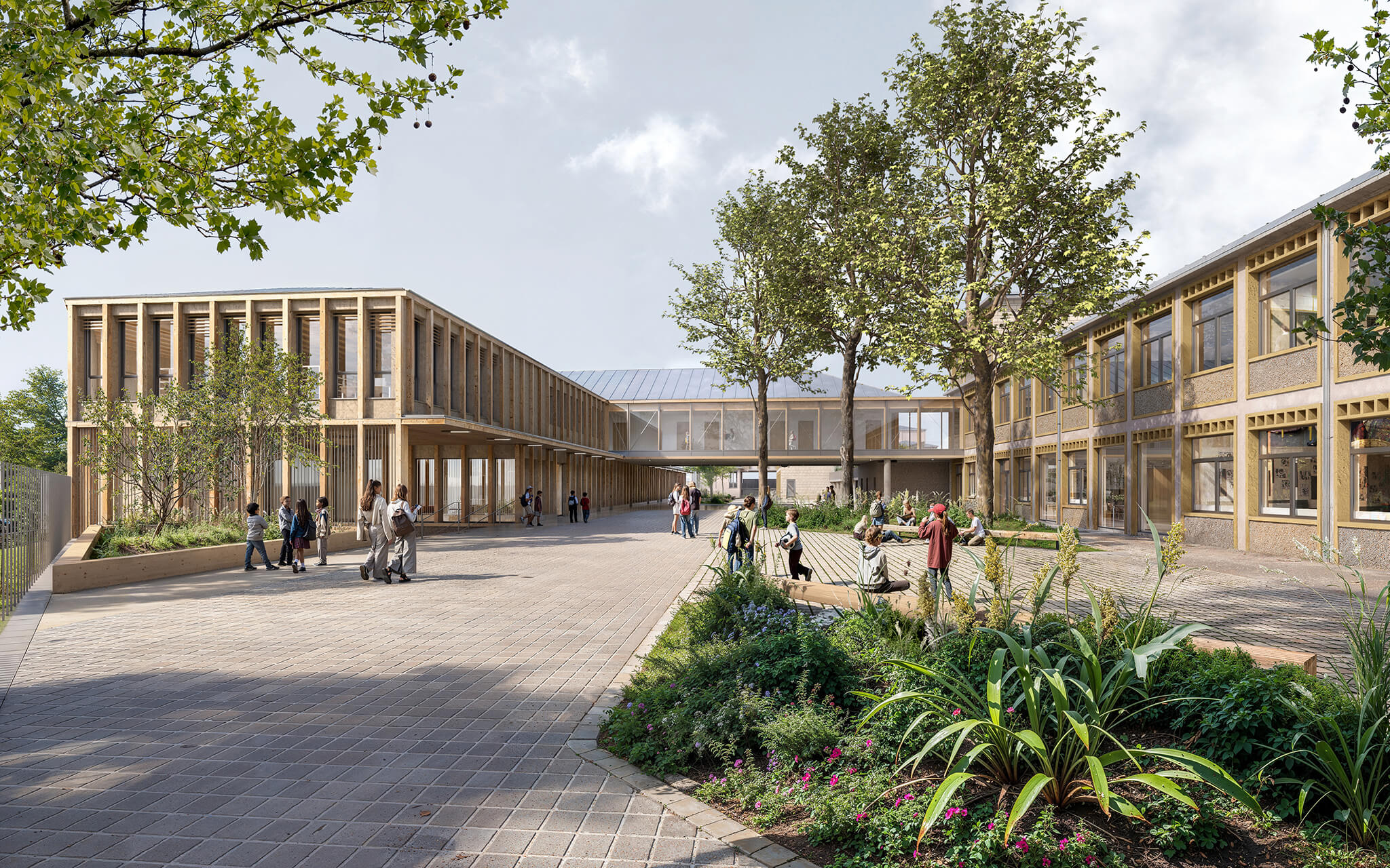 Les qualités paysagères du lieu composées d’arbres de haut jet, de talus et d’espaces verts sont maintenues le plus possible dans le cadre du projet. Des traitements paysagers variés recomposent les espaces extérieurs favorisant des îlots de fraîcheur et mettant à distance l’animation de la cour de récréation vis-à-vis de la restauration. Un nouvel espace facilite l’infiltration des eaux pluviales à la parcelle.