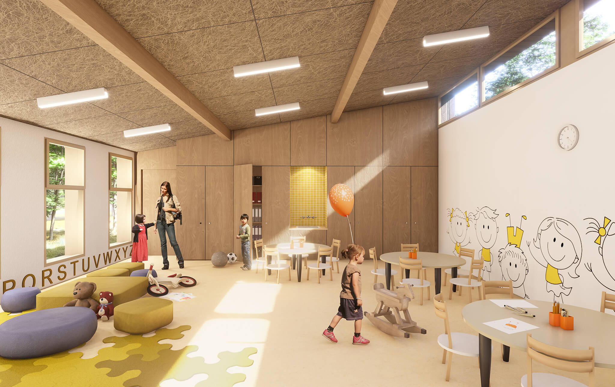 Une des qualités du site est la présence d’un espace boisé au Nord de la parcelle. L’extension s’installe sur une partie de ce dernier. Notre projet prévoit de conserver des arbres déjà en place pour intégrer le bois dans la cour de récréation des maternelles. Ainsi, tous les élèves profiteront d’une vue sur ces arbres.
