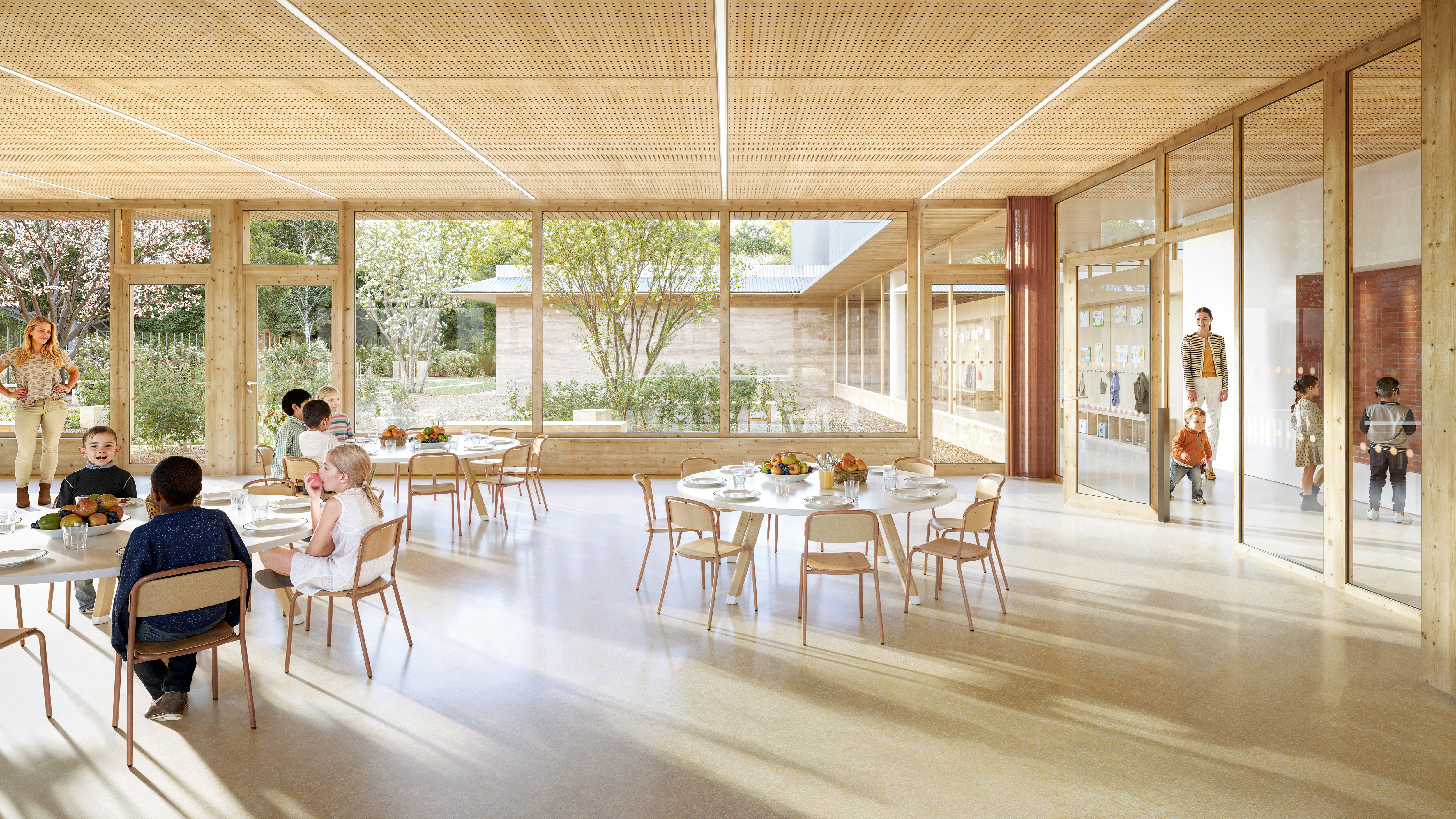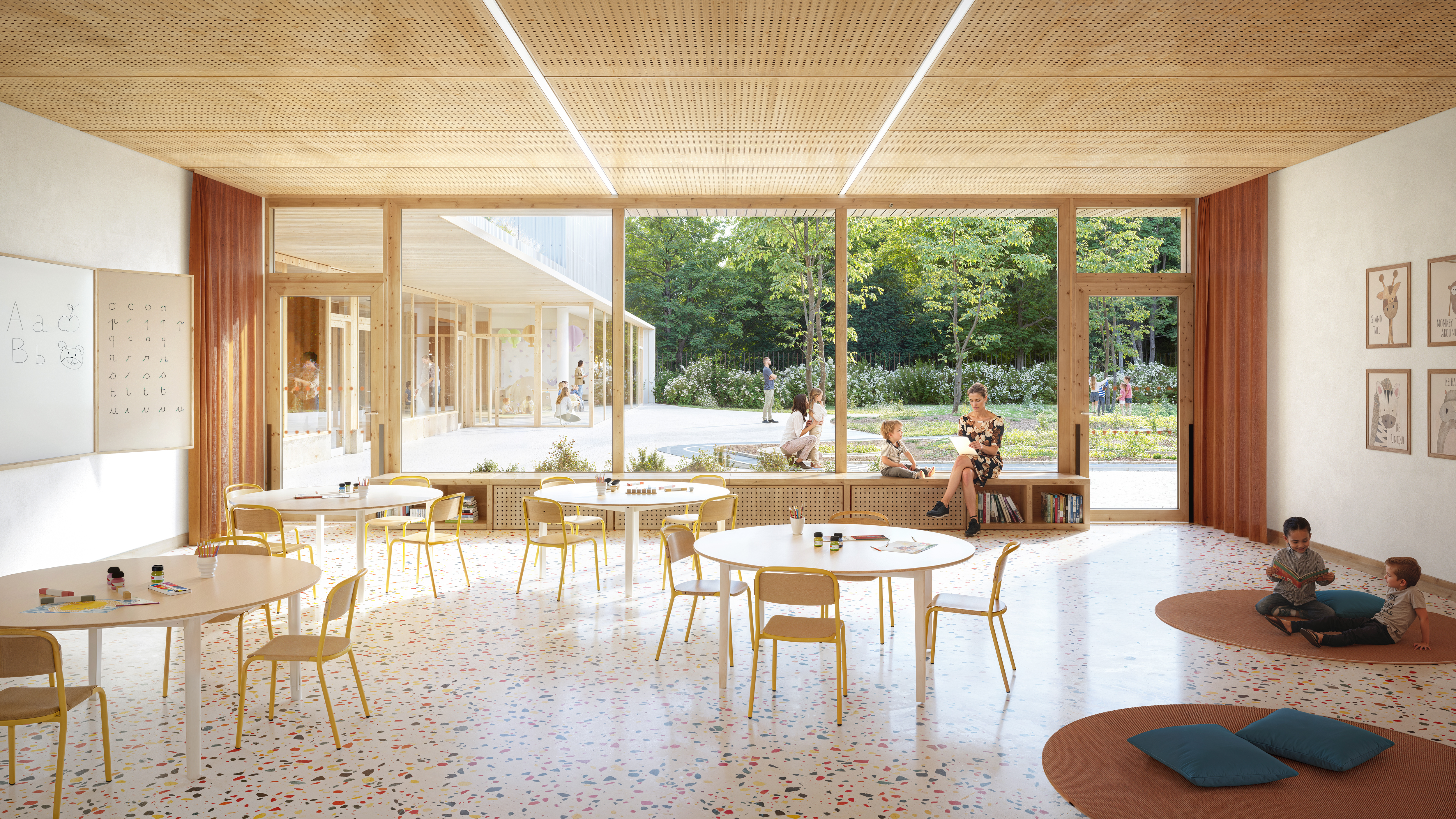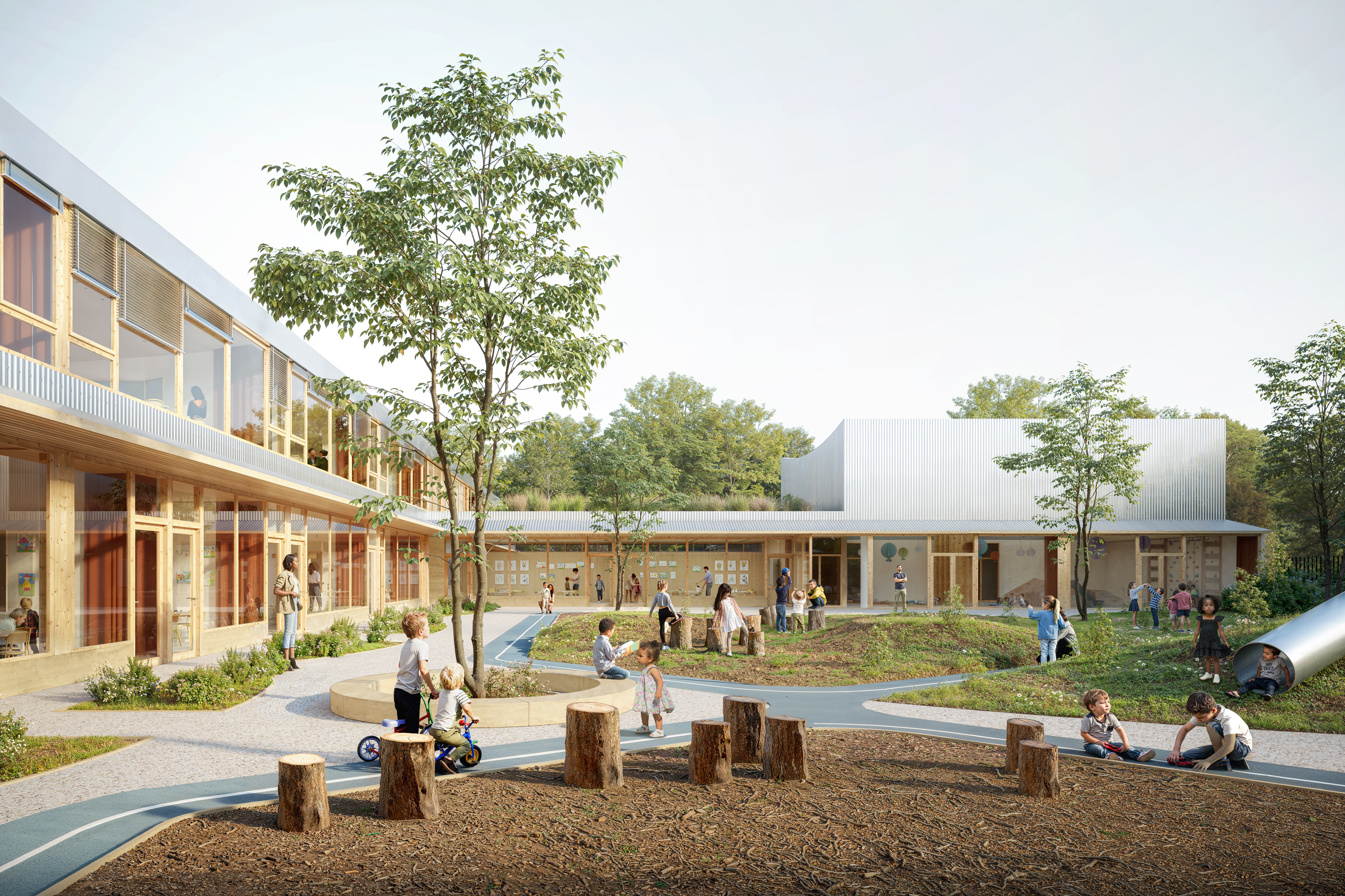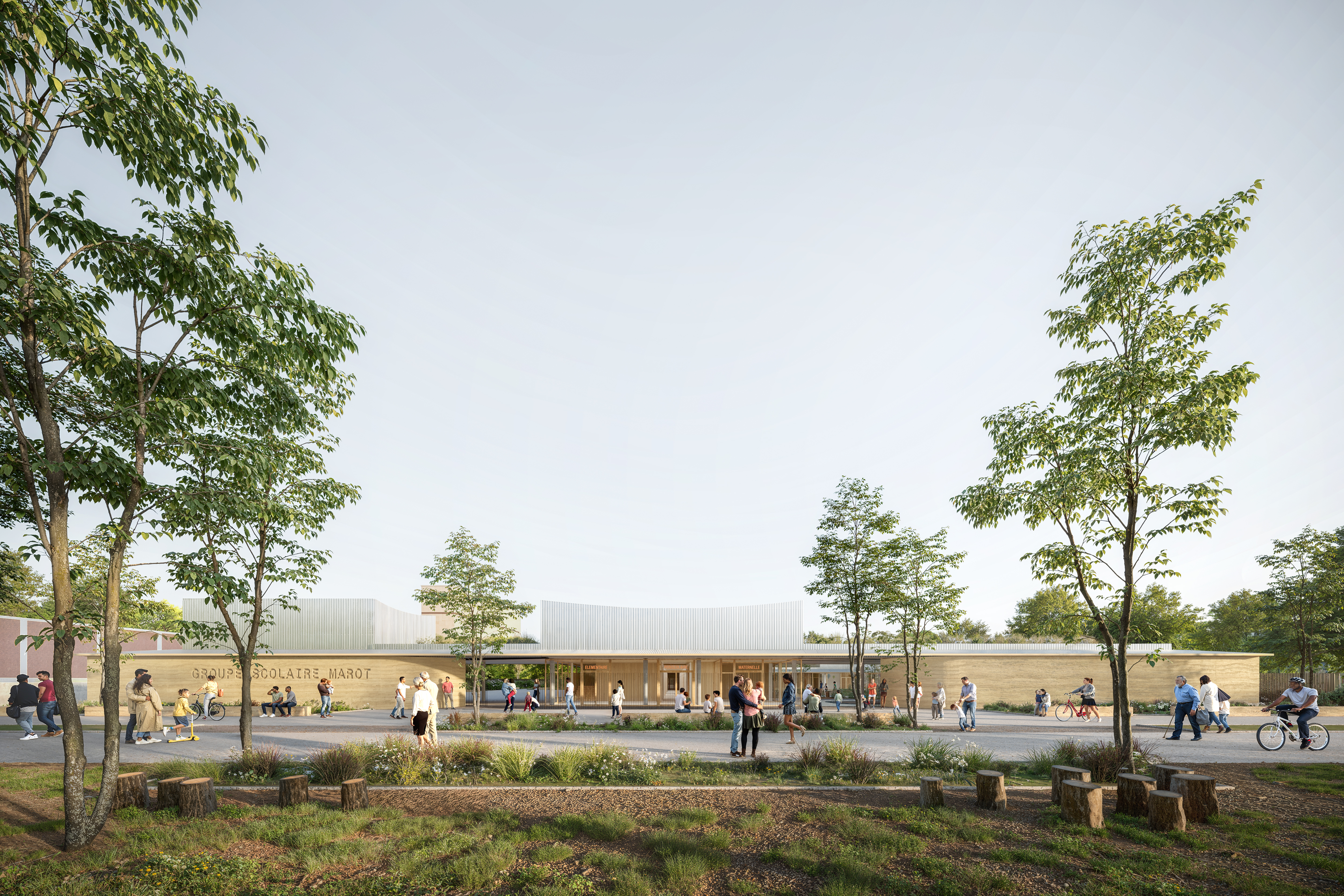 Situé dans un quartier en pleine transformation, le groupe scolaire Marot Villon s’inscrit dans le cadre du NPRU du Châtelet. Le projet prévoit la réhabilitation de l’école Clément Marot, seule conservée parmi les trois bâtiments existants, et son extension pour accueillir une école maternelle et une école élémentaire réunies dans un même ensemble. Une nouvelle façade à l’échelle des enfants restructure l’adresse de l’équipement sur l’espace public, en lien avec le nouveau mail paysager. L’architecture à rez-de-chaussée, ponctuée de volumes émergents (logement, salle de motricité), compose un bâtiment identifiable, en harmonie avec le site et la toiture courbe existante, conservée comme un repère mémoriel. Les deux écoles sont pensées pour fonctionner de manière autonome, avec des entrées, circulations et cours distinctes, évitant tout croisement de flux. Les espaces partagés (restaurant, motricité, arts plastiques) sont accessibles et adaptables, favorisant une grande souplesse d’usage et une possible évolution future. Les cours extérieures, orientées en fonction de l’âge des enfants, dialoguent avec leur environnement : forêt pour les maternelles, ville et gymnase pour les élémentaires. Un soin particulier est apporté au paysage : verger éducatif, séquences de jeux, jardins thématiques, et toitures végétalisées visibles comme de véritables cinquièmes façades. Le projet s’appuie sur l’existant pour limiter les constructions neuves et favoriser une approche environnementale sobre. Les extensions en structure mixte bois-béton, les matériaux biosourcés ou issus du réemploi (terre crue, laine de bois, bois, linoléum), les protections solaires passives et le raccordement au réseau de chaleur urbain participent à la performance énergétique du bâtiment.